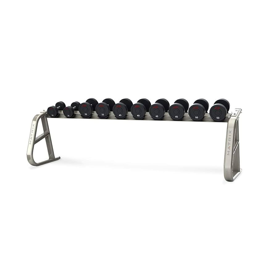 The refurbished Matrix Aura G3-FW90 is a rack designed to hold up to 5 pairs of dumbbells safely and securely. Perfect for professional gyms or home setups, it provides quick access to weights while keeping your workout area organized.