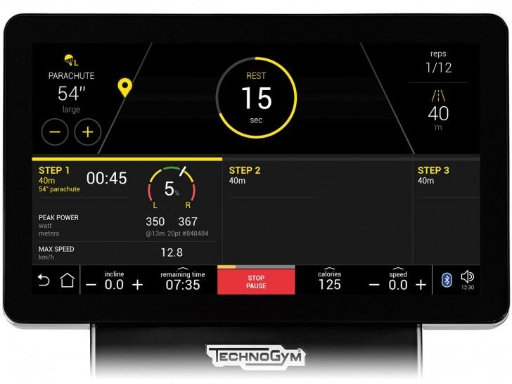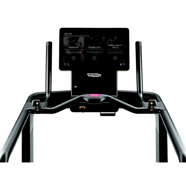 The 19" console allows monitoring of key metrics: speed, distance, calories burned, and heart rate. It is compatible with Technogym Live programs, providing interactive routes and Bluetooth heart rate belt connectivity.