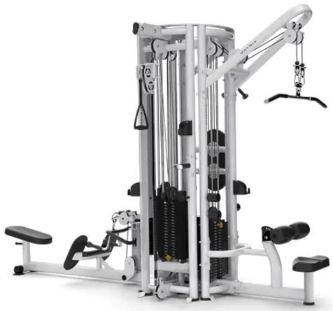 Construído em aço robusto com acabamento em powder coating, esta multiestação é ideal para uso intensivo em academias. As imagens são ilustrativas e podem variar. Acessórios como barras, discos e alças são vendidos separadamente.